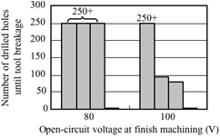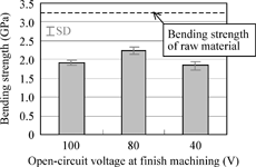 | The bending strength of cemented tungsten carbide 10-µm-diameter micropins fabricated by micro EDM was investigated. Although the bending strength increased with a decrease in the electrical discharge energy at the finish machining of micropins, it decreased at lower discharge energy. This result was then applied for the EDM fabrication of cemented tungsten carbide ultrasmall-diameter cutting tools. Paper (Journal of Japan Society for Abrasive Technology, Vol.56, No.6, 2012, pp.395-399) |  |  | | Relationship between open-circuit voltage at finish machining and bending strength of micropins | Relationship between open-circuit voltage at finish machining and tool life |