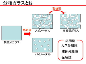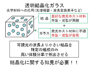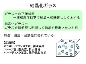 「ガラスの材料としての特徴を活かしながら、新たな機能を賦与する。」そのための基本となる考え方の一つは、「ガラスは非平衡状態である。」ということです。すなわち、ガラスは、熱力学的に不安定であり、常に異なった状態、異なった構造(例えば結晶相)に変化している(しようとしている)と言うことです。 このような変化は、ガラスに外部から熱を加えたり、レーザ光のような強い光を照射したりすることによって、より顕著に現れますが、このダイナミックな変化を詳しく解析し、うまくコントロールすれば、普通の方法では生成し得ない特異な性質をもった構造体をガラス中に出現させることができると考えられます。これにより、高い機能を持った材料を開発することが可能になると期待されます。 |