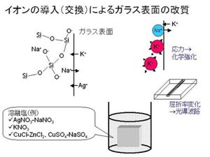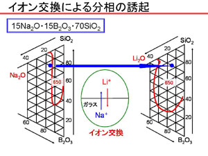 @ガラスへのイオンの導入と構造・物性の制御 ガラスは固体ですが、イオンが移動することができます。このため、ガラスに含まれるイオンを選択的に別のイオンに置き換えることが可能です。これをイオン交換といいます。イオン交換は、通常、ガラスを硝酸銀(AgNO3)などの溶融塩に浸漬することによって行います。このようなイオン交換は、これまで、強化ガラスの作製やガラスを基板とした光導波路などの作製に用いられてきました。しかし、これ以外にもイオン交換による様々な物性・構造の変化を利用すれば、新規なガラス材料の創製につなげることができると期待されます。 ![]() ![]() ![]() ![]() |