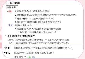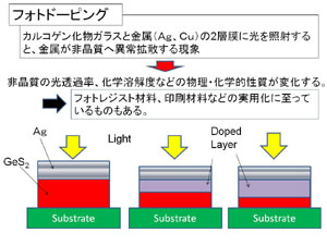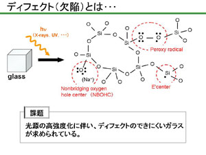 Bディフェクトの生成と応用 ガラスにX線や紫外線を照射すると様々なディフェクト(欠陥・カラーセンタ)が生成されます。これらのディフェクトは、多くの場合は光吸収をともなうため、これまであまり好ましいものとは考えられていませんでした。しかし、近年、ディフェクト生成による屈折率の変化を利用した光学デバイスの開発や、可視域での吸収を、ガラスの着色に応用する研究がなされています。 私たちは、特に多成分ガラスについて、ディフェクトの生成とその応用、更にはディフェクトをトリガーとするガラス中での様々な反応について研究しています。 ![]() |