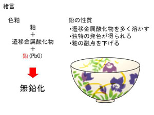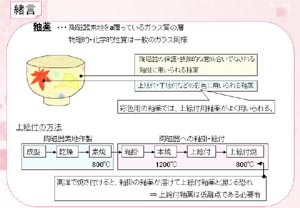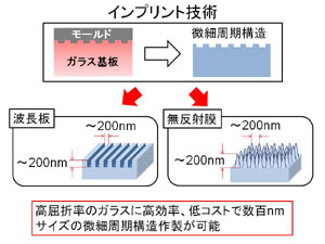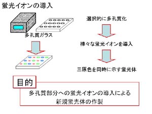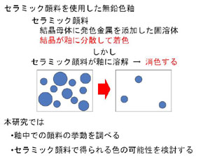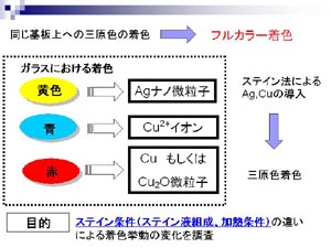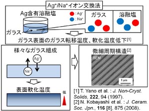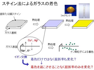 Aステイン法の新展開 ガラスの着色技術の一つにステイン法という手法があります。ステイン法によるガラス着色プロセスでは、ステインに含まれるイオンとガラスに含まれるイオンが交換する反応が起こっていると考えられています。我々はステイン法を単なるガラスの着色技術ではなく、イオンの導入技術としてとらえ、これを利用した新たなガラス材料の創製を目指しています。ステイン法の特徴はステインを塗布した部分にのみイオンが導入されるということです。従って、印刷技術を用いれば、高精細にイオンを局所的に導入することができます。この技術を用いて、簡便なマイクロ光学素子の作製、ガラスの描画・マーキング技術の開発研究に取り組んでいます。 (用語の説明:ステイン法) ステイン法は、ガラスにステインと呼ばれる銀や銅の無機塩、有機樹脂、有機溶媒からなる混合物を塗布し熱処理することによってガラスそのものを着色する技術です。熱処理の過程でステイン中に含まれる銀や銅イオンがガラス中の1価の陽イオン(アルカリイオン)と交換する「イオン交換反応」が起こっていると考えられています。ガラスが着色するのは導入された銀や銅イオンが還元され金属ナノ微粒子を生成するためです。 ![]() ![]() ![]() ![]() ![]() |