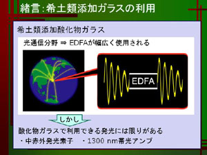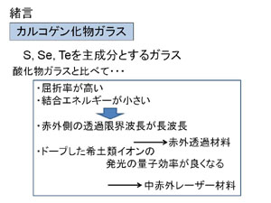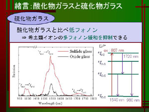 カルコゲン化物ガラスを中心とした非酸化物ガラス材料の研究を行っています。これらのガラスに希土類イオンや遷移金属イオンをドーパントとして導入することによって発光材料への応用を目指しています。 (用語の説明:非酸化物ガラス) ハロゲン化物やカルコゲン化物を主成分とするガラスを非酸化物ガラスといいます。非酸化物ガラスは、高い赤外透過性を有するなど酸化物ガラスにはない多くの特徴を持っています。また、ガラスを構成する原子間の結合は、イオン結合的なものから共有結合、あるいは金属結合的なものまでバラエティに富み、構造的にも興味深いものが数多くあります。 ![]() ![]() ![]() ![]() |