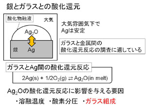 @ガラス融液における化学平衡 ガラス融液中の酸化還元反応は、清澄反応、金属との接合、イオンの価数制御などにおいて非常に重要となります。この研究では、Ag、Ni、Fe、Co、S等の酸化還元平衡を測定し、その酸化還元反応や金属の溶解などに及ぼすガラス組成の影響の解明を目指しています。 ![]() |
