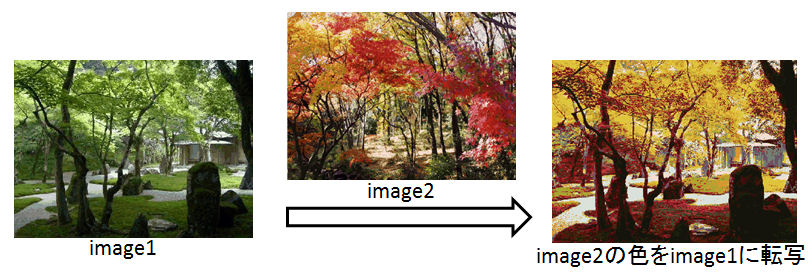 色彩の復元・着色精度は向上するため、Photo Shop等市販の画像処理で実現が難しいです。そのため、画像間の色変換の研究を行います。画像間の色変換を2種類に分けています。(1).複雑な色分布への対応。(2).主観的な転写意図への対応。下記は(2)となる例であります。