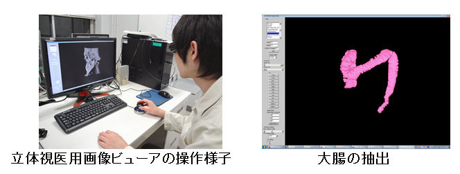 本研究では3 次元画像処理による診断支援ツールから構成されるCAD システムを開発します。従来のCAD システムの問題として、3 次元CT 画像を平面ディスプレイで表示しており、立体感や奥行き感が少なく、部位の位置関係が把握しにくいということがありました。本研究では、医用画像をステレオ表示(立体視)することで立体感や奥行き感を出し、部位の位置関係を把握しやすくします。 例:医用画像を立体視、直感的に操作できる立体視医用画像ビューアの開発 ![]() |