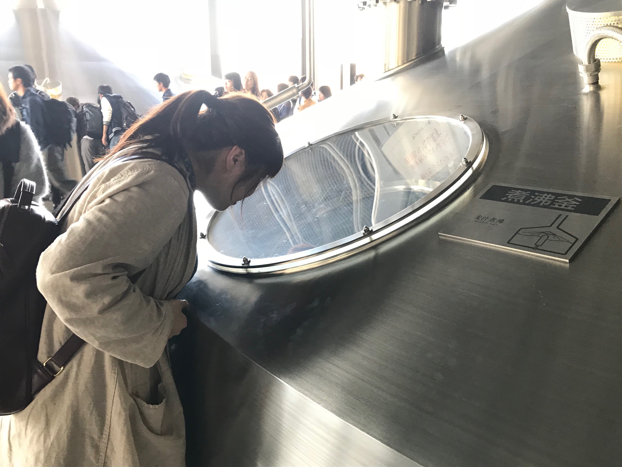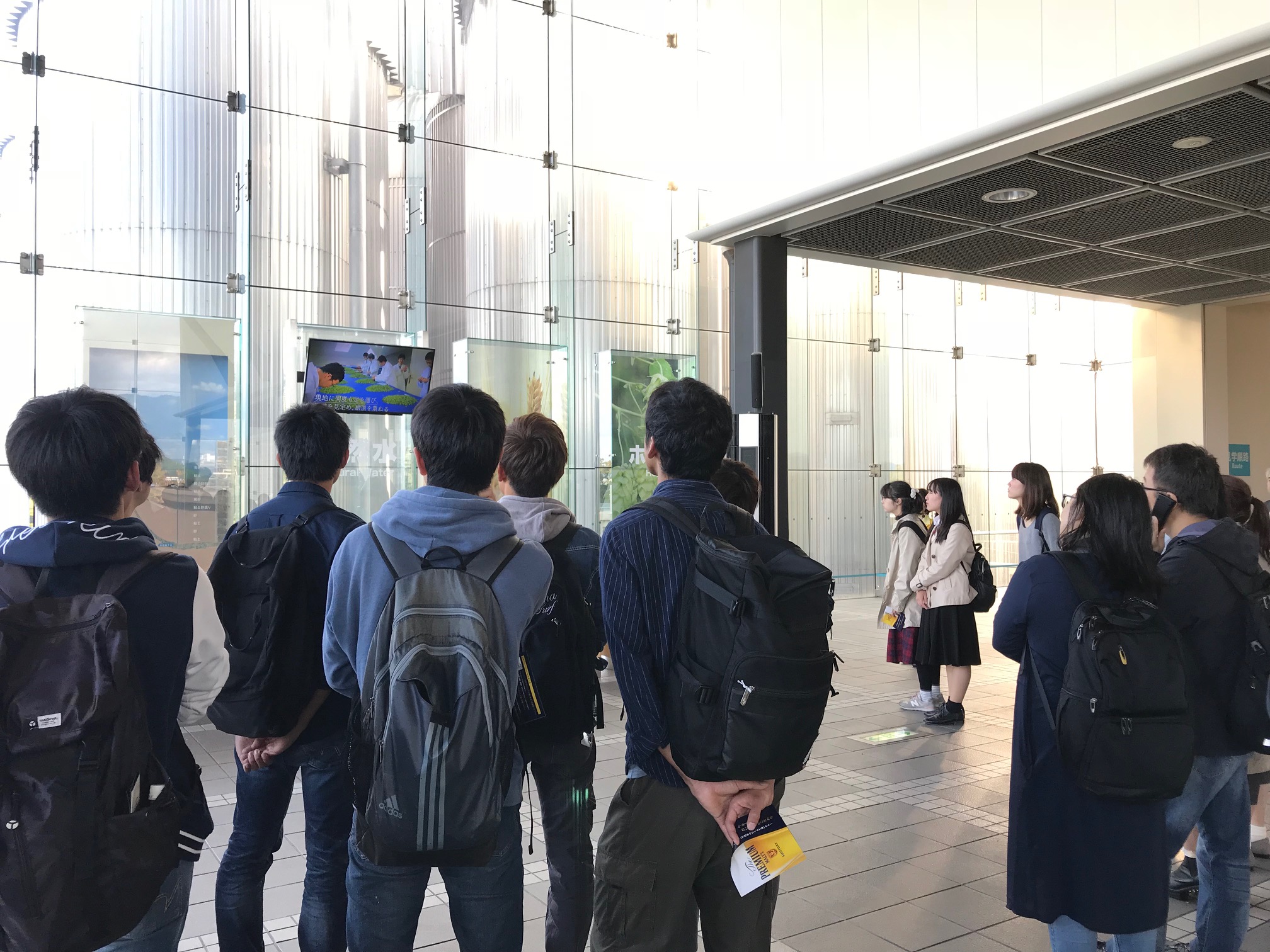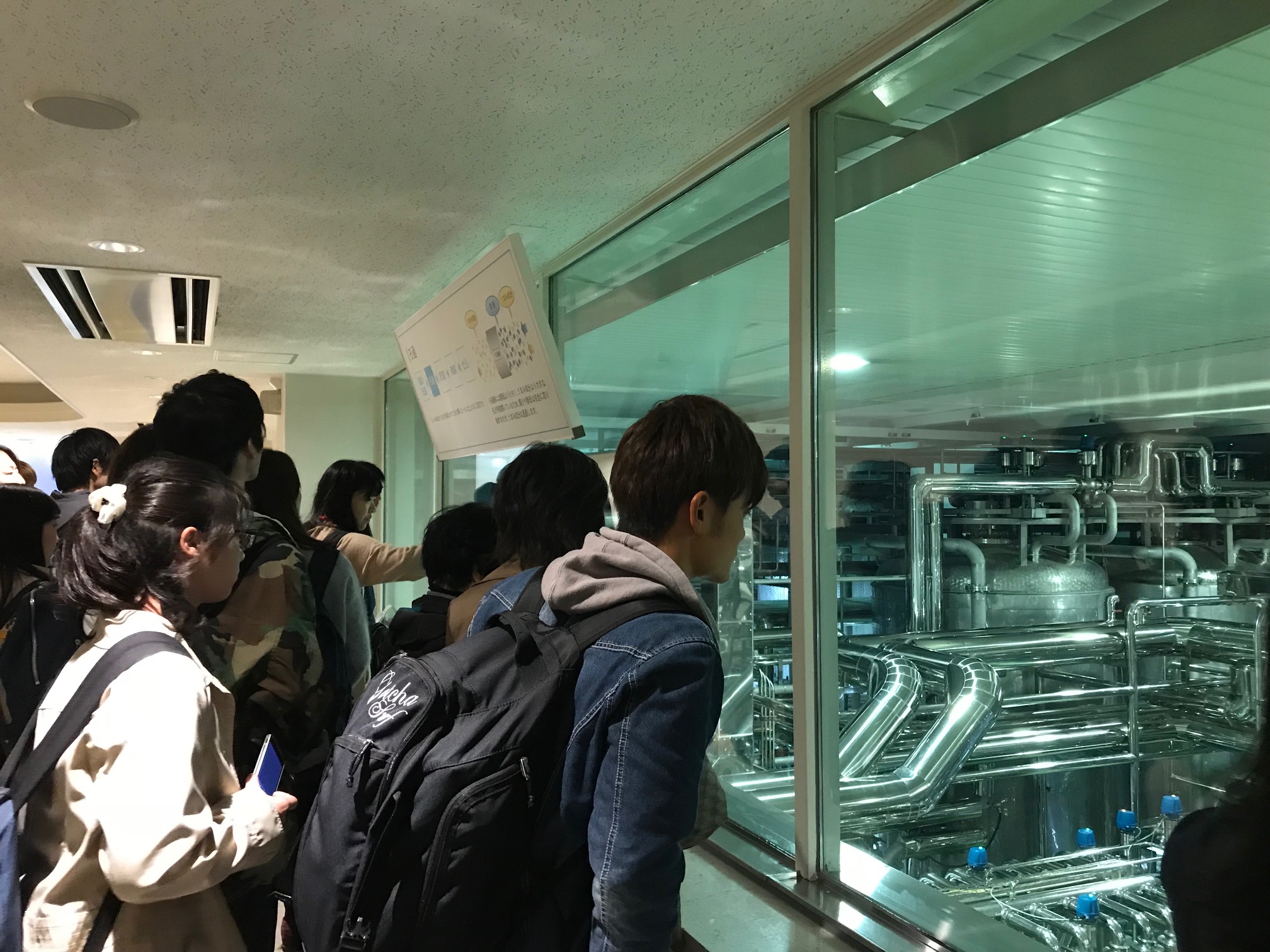 学部「微生物工学」の授業について 学部2回生後期配当の「微生物工学」の授業では、毎年工場見学を実施しています。 今年は、サントリー京都ビール工場と黄桜三栖工場の見学を実施しました。 平成29年10月25日 サントリー京都ビール工場 今年は受講生の人数が多く、2班に分かれて工場内を見学しました。 工場見学前の説明 ビールの原料について説明を受けました。 麦汁の煮沸釜はとても大きかったです。 濾過装置が並んでいます。 ←前のページ|次のページ→