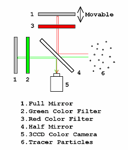照明強度・粒子の散乱条件の不均一などのため、同じ画像ぼけを示しても同じ奥行き距離に対象物体が存在しないこともあります。そのため、焦点位置の異なる2台のカメラを用いて同じ対象物体を同時に観測し、照明強度のバラツキ等の影響を相殺して奥行き位置を求めるという手法が取られます。本研究グループでは、カメラ設定の簡便な単眼計測を行うために、下図に示す光学系と3板式CCDカメラを用いています。上の全反射鏡(1)を上方に移動させると緑と赤の経路の長さに違いが生じ、画像ぼけ程度の異なる像が観測されます。そして、それら焦点位置の異なる画像を赤画像および緑画像として記録し、それらの2枚の画像間で演算を行って粒子奥行き位置を求めます。 |