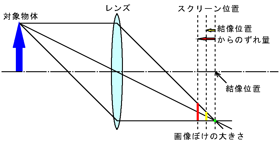 depth-from-defocus です。下の図のように、対象物体を凸レンズでスクリーンに結像させる場合を考えると、レンズの結像公式を満足する位置では、対象物体のある1点からでた光はスクリーン上の1点に集まりますが、スクリーン位置がずれるとそのずれ量に相当する大きさの領域に光は広がります。これが画像ぼけとなります。逆にこの画像ぼけの大きさを画像処理で求めると、結像位置からのずれ量を得ることができます。そして、そのずれ量とその時のスクリーン位置とから結像位置がわかるので、レンズの結像公式からレンズ−対象物体間距離が求まります。 |