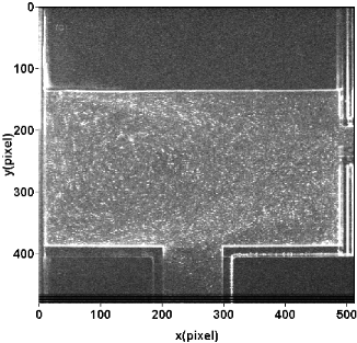 PIV)は、従来の熱線流速計やレーザー流速計のようにある測定点における流速を測定する手法と異なり、2次元または3次元空間における速度分布を時々刻々測定できる点に特徴があります。下の図は右側面から噴流が左向きに出ており、水槽内を循環しながら底面の流出口から下方に流れ出ている様子を可視化しています。この流れの可視化は古くから行われており、流れの定性的な様子を観測するための手法でしたが、最近ではディジタル画像処理が高精度化・高速化され、流れの可視化画像を画像処理して流速分布などの定量計測が可能となりました。これが粒子画像流速測定法であり、2次元画像を用いるため流速が空間分布として得られます。解析手法は様々なものが提案されていますが、下図のような時系列の画像を並べて局所的な可視化パターンを時間的に追跡することがよく行われます。 |