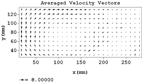 下の速度ベクトル図は上に示した流れ場を画像解析した時間平均結果です。右側壁からの流入部が少し不明瞭ですが、左半分の領域において時計方向に旋回する流れが観測できています。標準的な画像取り込みボードと短時間に2回連続パルス発光できる照明装置があれば、かなり高速の流動現象も捉えることが出来ます。 |