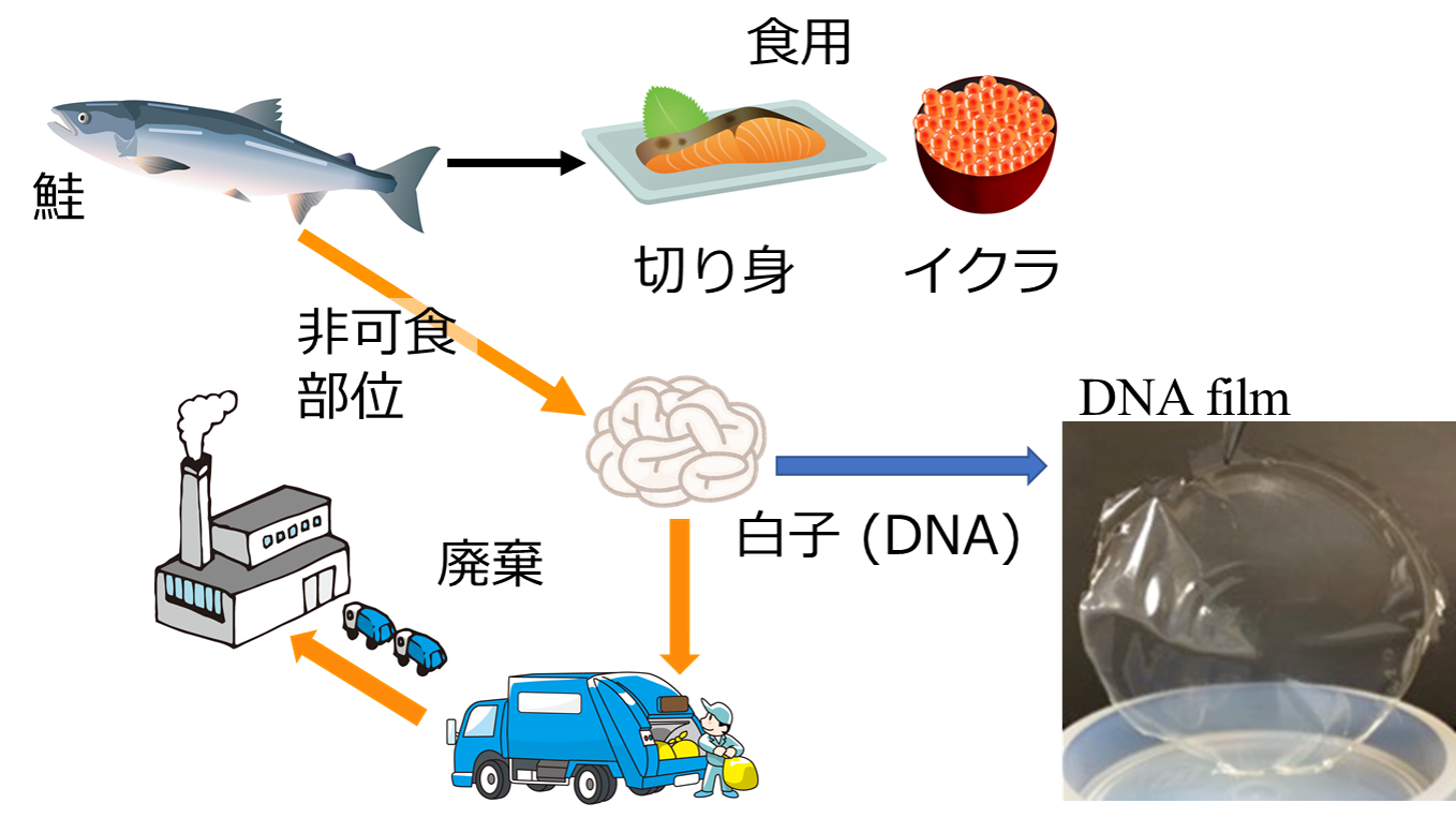 鮭の身やイクラ(卵)は食用として魚から取り出されますが、鮭の白子は食用として活用されることはありません。この精巣組織には、DNAが含まれています。このDNAも自然が作り出している天然高分子素材です。DNAにはタンパク質や多糖類には無い構造上の特徴があり、その構造上の特徴を利用した機能性材料の研究を行なっています。