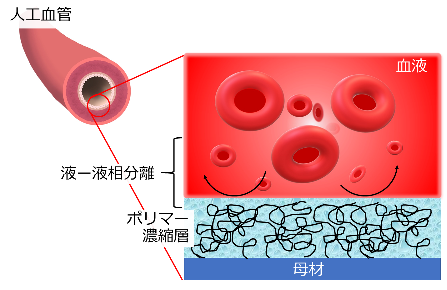 人工臓器材料で使用される素材は固体ですので、その固体とヒトの身体の中の成分との間には固ー液界面ができます。この界面の存在が、生体成分の接着や吸着を引き起こしています。私たちは、水溶性のポリマーの中で、液ー液相分離するポリマーを利用して、基材表面にこのポリマーを修飾し、ポリマーが作り出す液ー液界面の生体成分との相互作用について調べています。