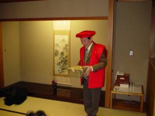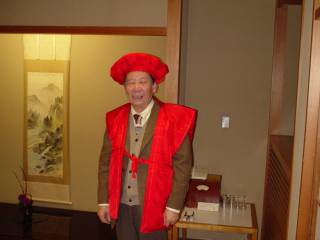 赤いちゃんちゃんこの贈呈 その場で着ていただきました |