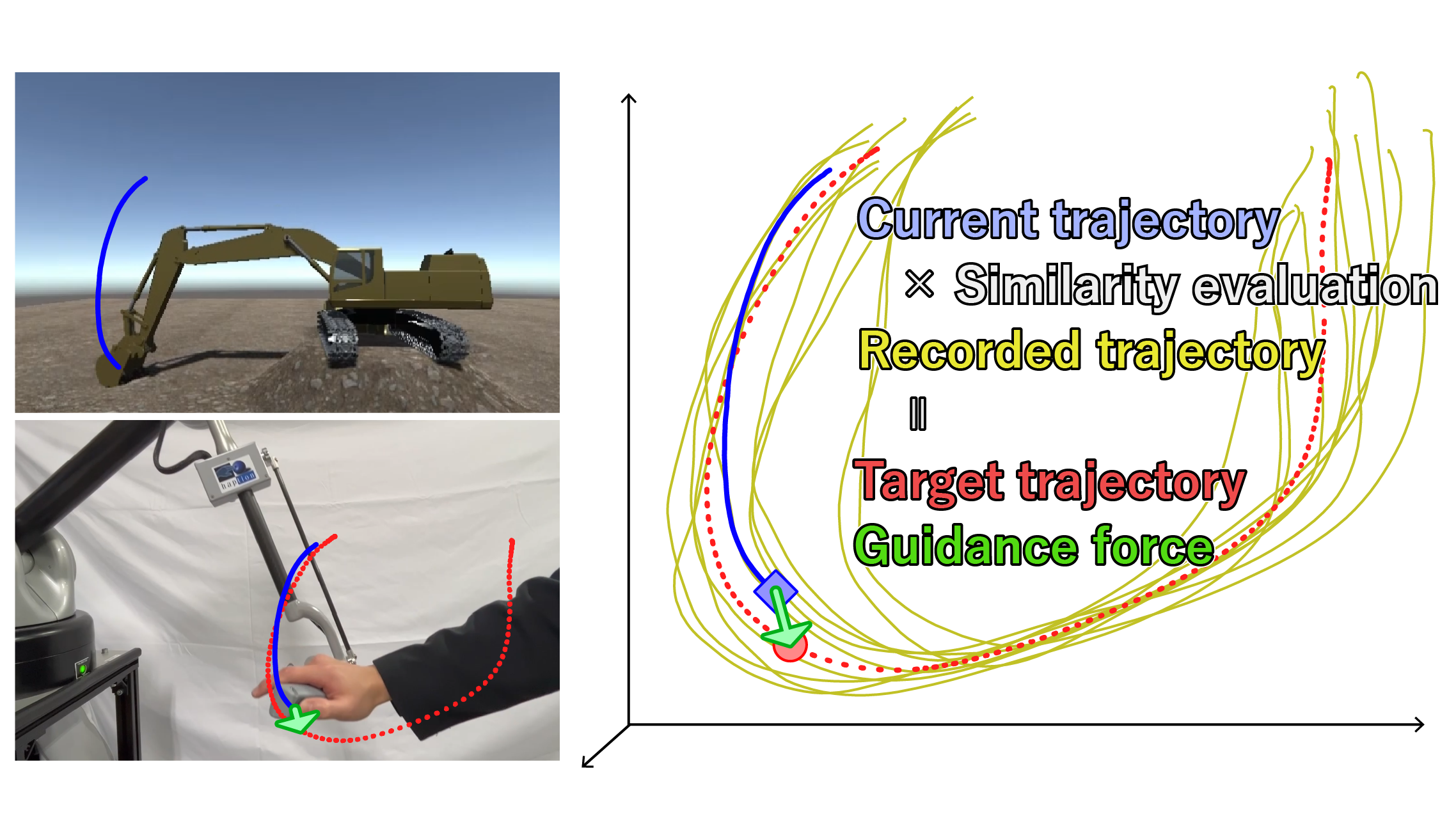 操縦軌道の事前学習とリアルタイムでの軌道類似性評価に基づき目標軌道を算出し,軌道に追従する力覚提示を行うことで,操縦者の身体的・精神的負担を軽減する操縦支援システムを構築した.